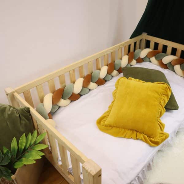 Deze bedbumper in tinten van vanille, kaneel en eucalyptus biedt zowel veiligheid als zachtheid. Het kan ook als decoratie gebruikt worden. Dankzij de hypoallergene samenstelling en kleurrijke linten is het een perfecte keuze voor elke kinderkamer.