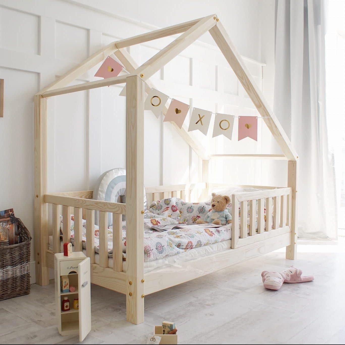 Het Bedhuisje Hector biedt een geruststellende ruimte die dromen bevordert. Zijn vorm van een huisje creëert een gevoel van bescherming, wat een rustige en herstellende slaap bevordert. Ideaal voor de overgang naar een groot bed, het is eenvoudig te monteren en ontworpen om lang mee te gaan.