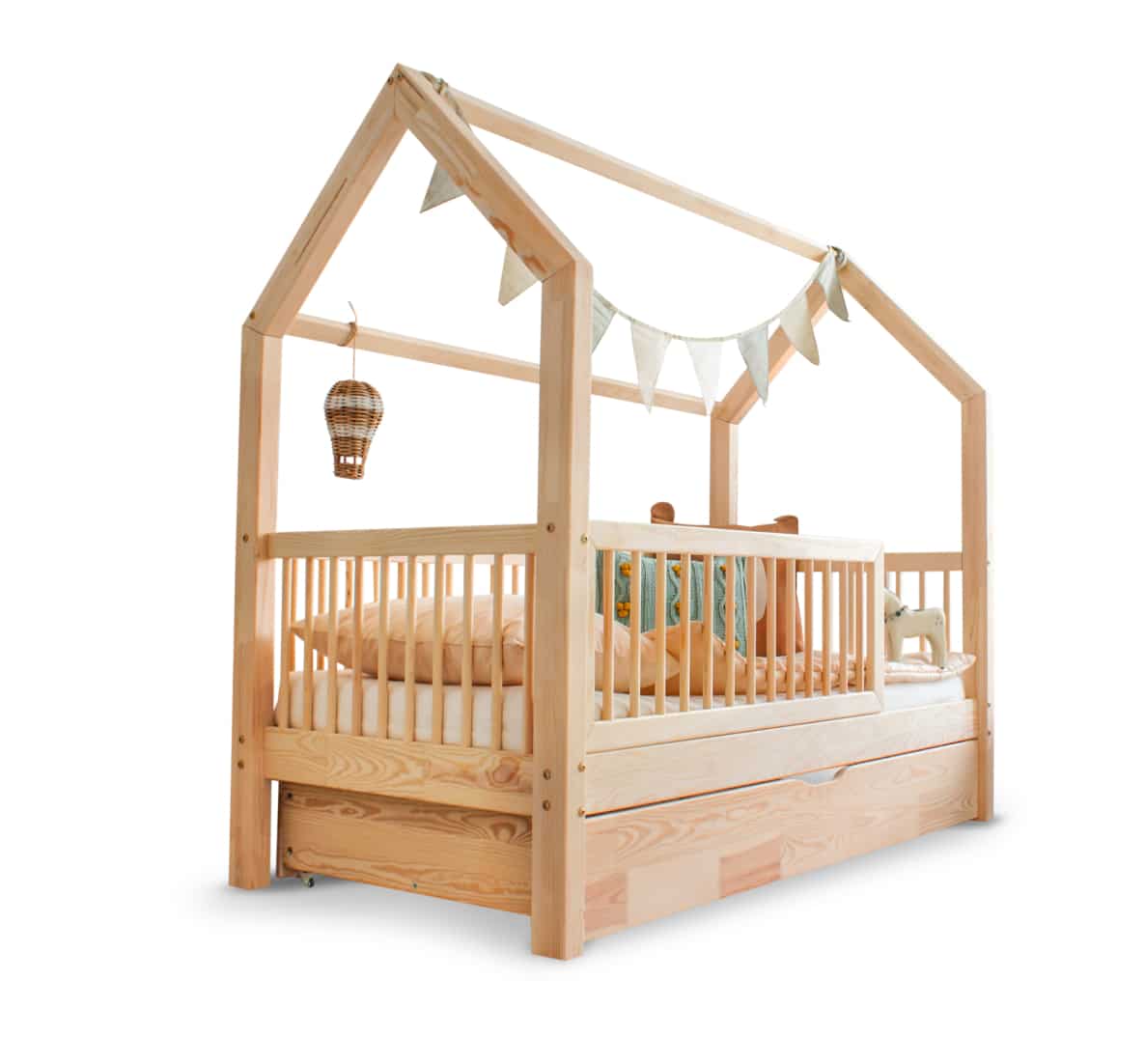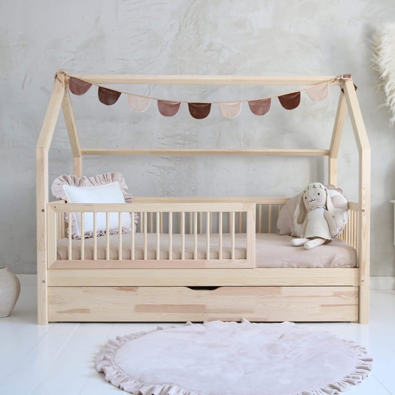Het Bedhuisje Helsinki met lade biedt een unieke Noordse slaapervaring, ontworpen om het leven van ouders gemakkelijker te maken met een eenvoudige montage. Vervaardigd uit hoogwaardig grenenhout, creëert dit bed een veilige en comfortabele slaapomgeving, terwijl het eenvoudig en snel te monteren is.