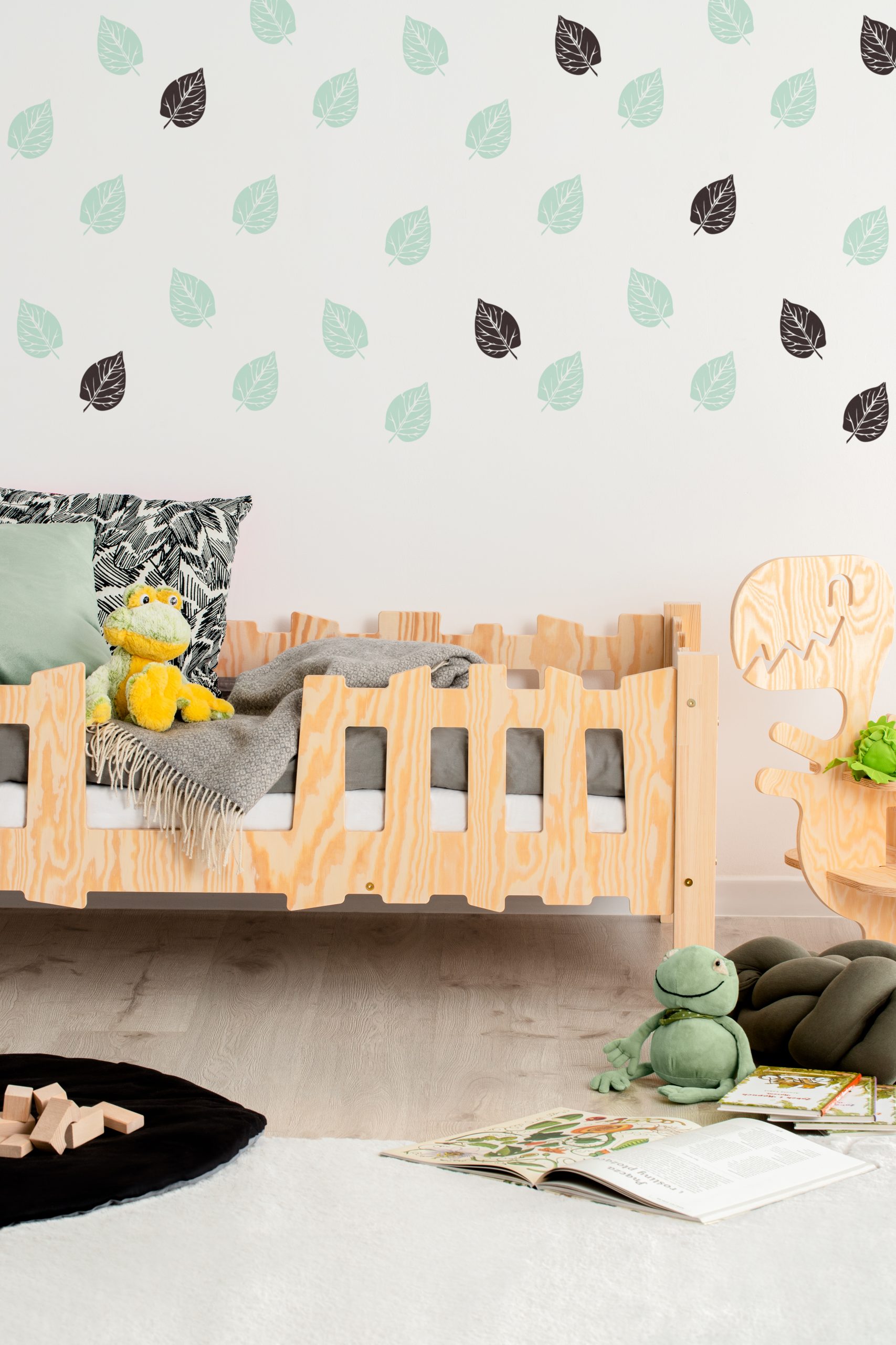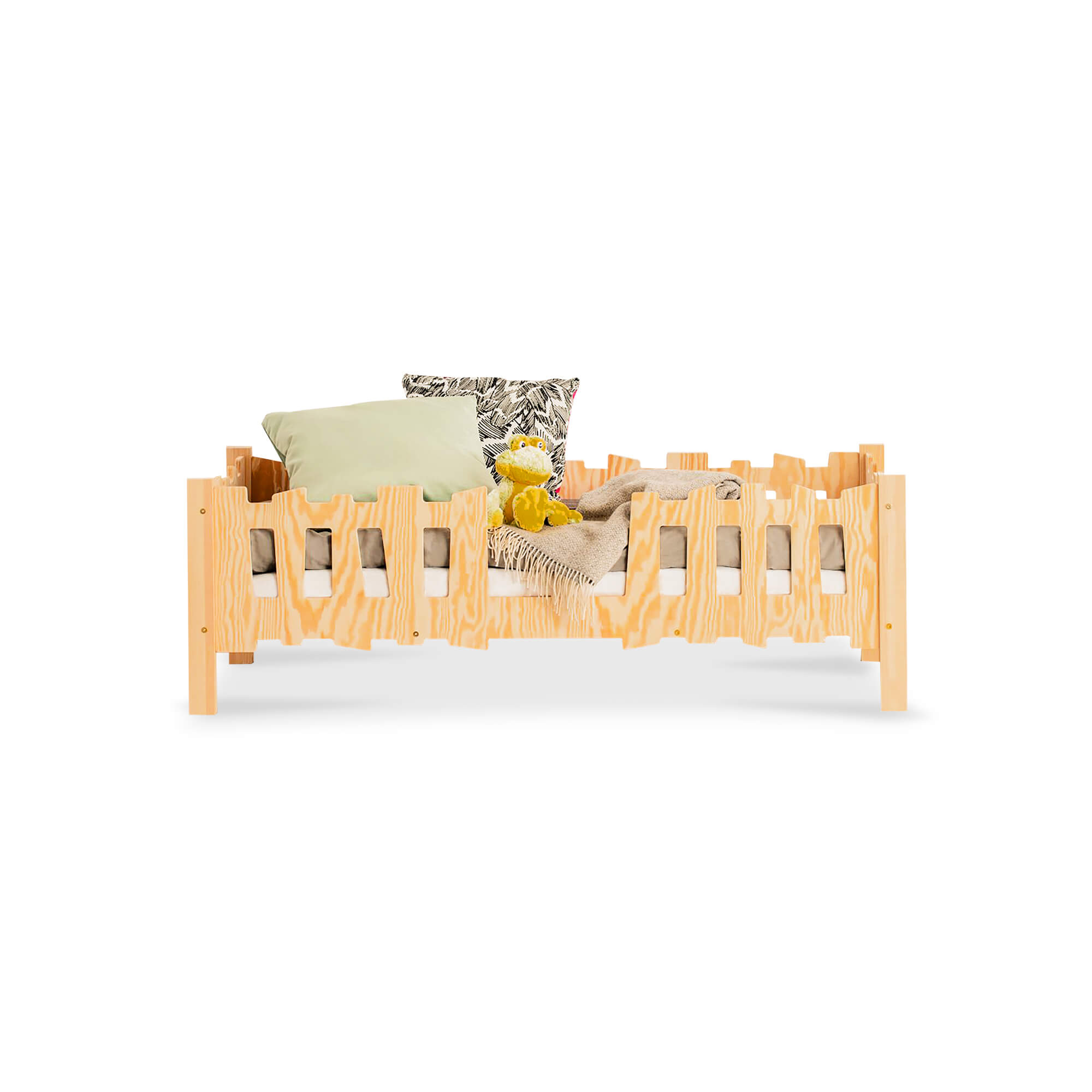 Veiligheid staat centraal in ons ontwerp. Met een slim geïntegreerde reling voorkomt dit bed dat uw kind tijdens de slaap uit bed valt. Het biedt gemoedsrust voor elke moeder. Dit bed is een overgang naar zelfstandigheid. Het eenvoudige maar elegante ontwerp en het ruwe hout passen perfect in elke kinderkamer.