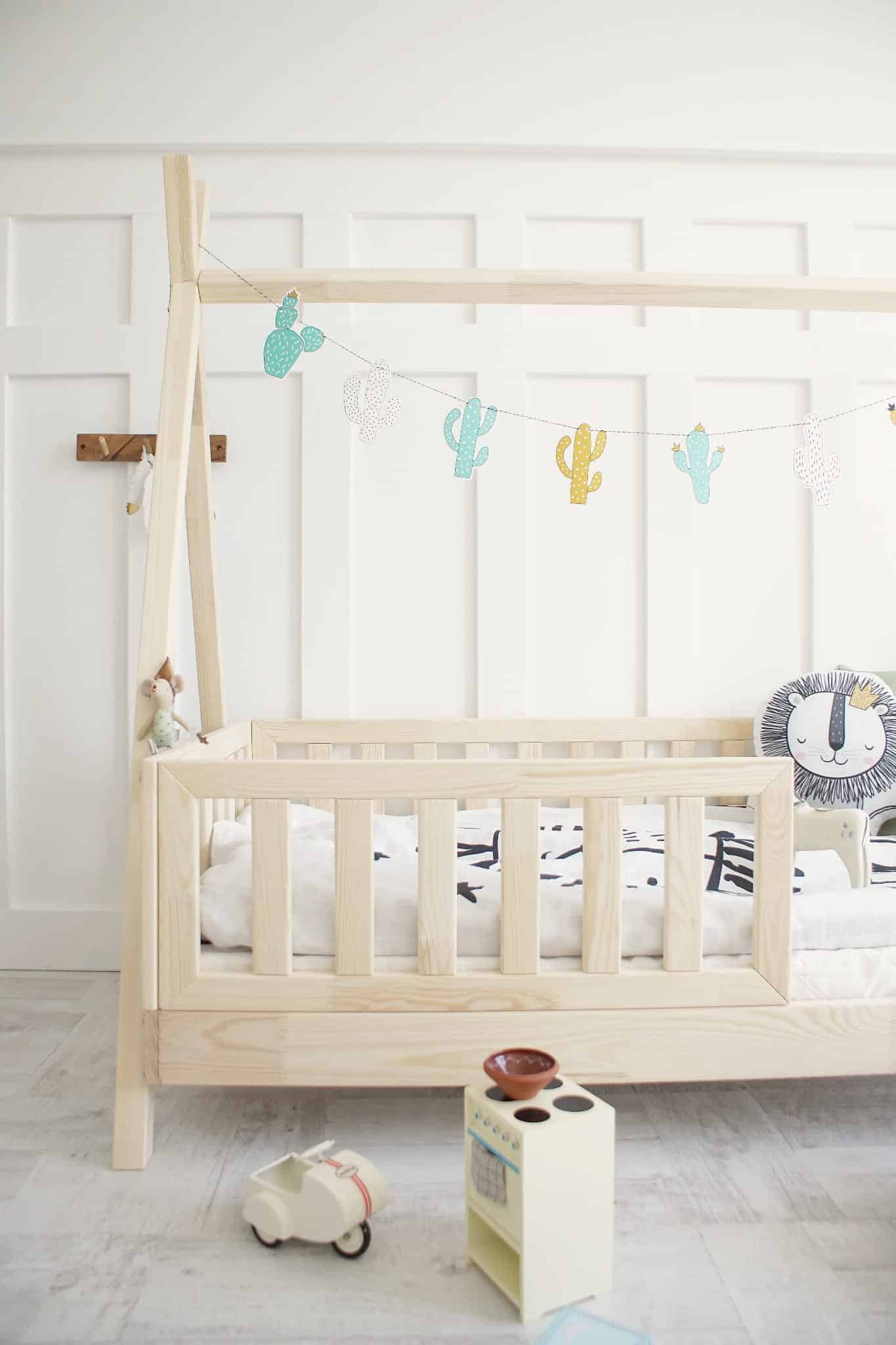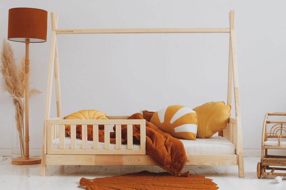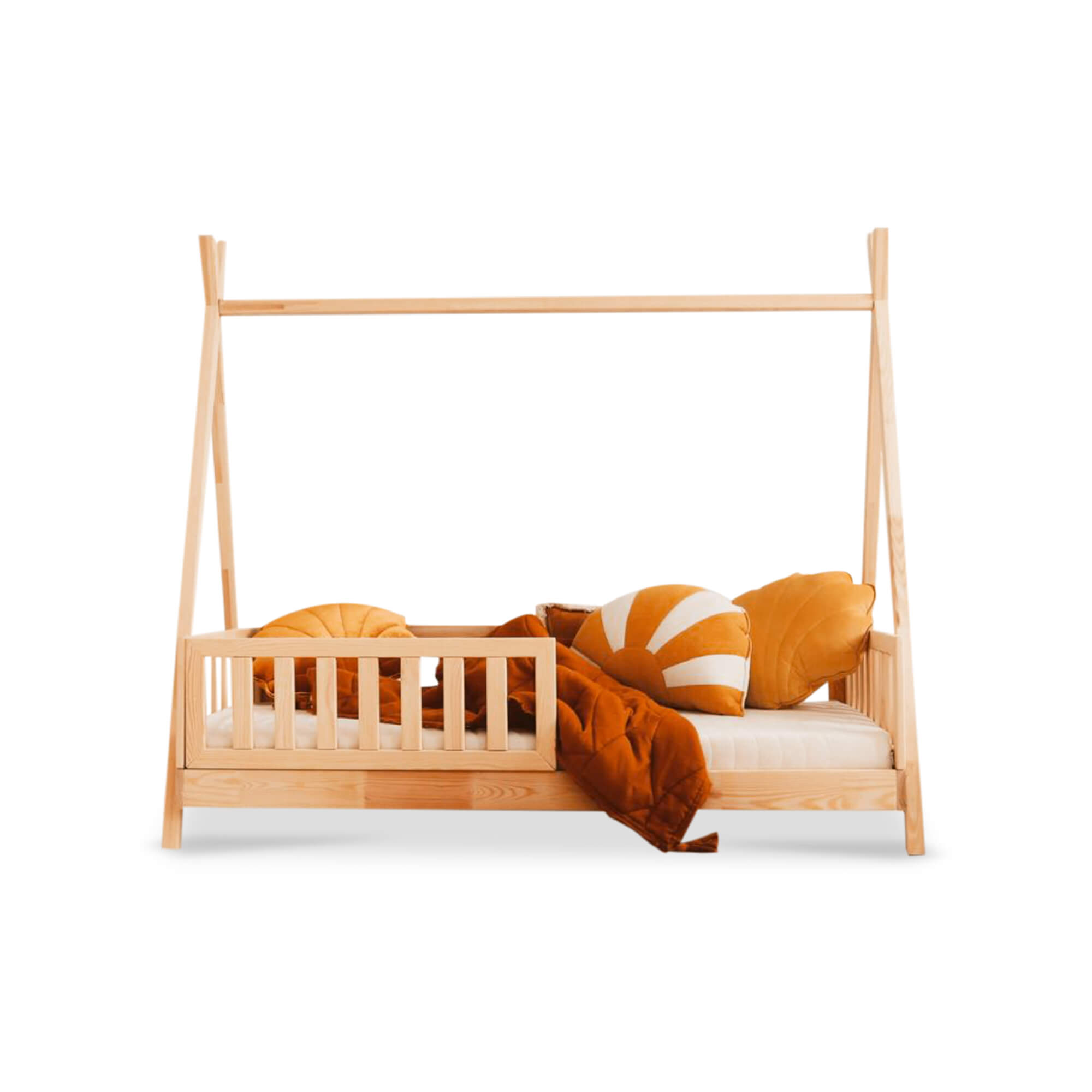 Gebouwd van hoogwaardig grenenhout en ontworpen om slijtage te weerstaan, biedt het Tipibed Oslo met uitvalbeveiliging veiligheid voor uw kind dankzij de afgeronde, gladde randen en een stevige structuur die tot 100 kg kan dragen. De verwijderbare reling en de aangepaste hoogte van het bed bieden een veilige slaapomgeving terwijl ze toch een open en uitnodigende sfeer behouden.
