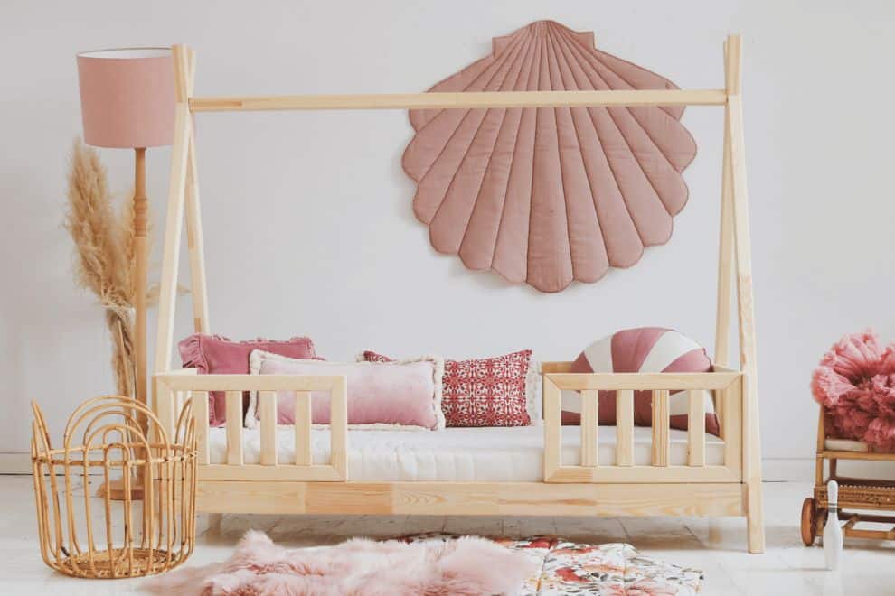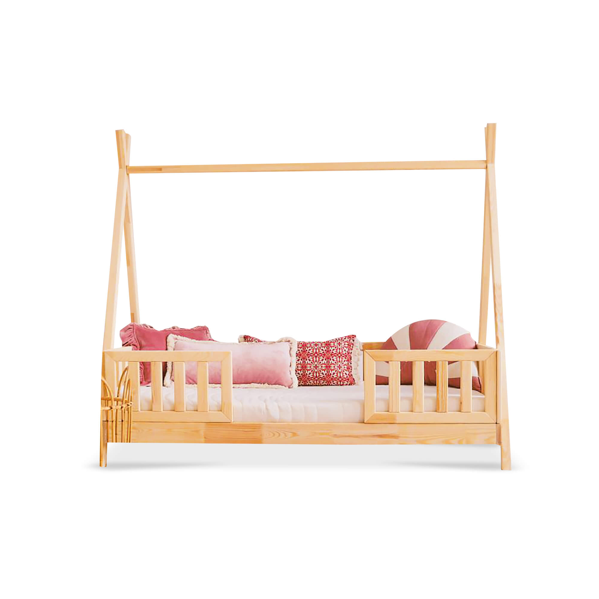 Het Tipibed Oslo met centrale toegang is gemaakt van hoogwaardig grenenhout, wat duurzaamheid en veiligheid garandeert. De stevige structuur kan tot 100 kg dragen, en de randen zijn zorgvuldig afgerond om risico’s op verwondingen te vermijden. De strategisch geplaatste reling rond de centrale toegang biedt optimale veiligheid terwijl het een uitnodigende opening behoudt, waardoor het voor het kind gemakkelijk is om zelfstandig in en uit bed te komen.