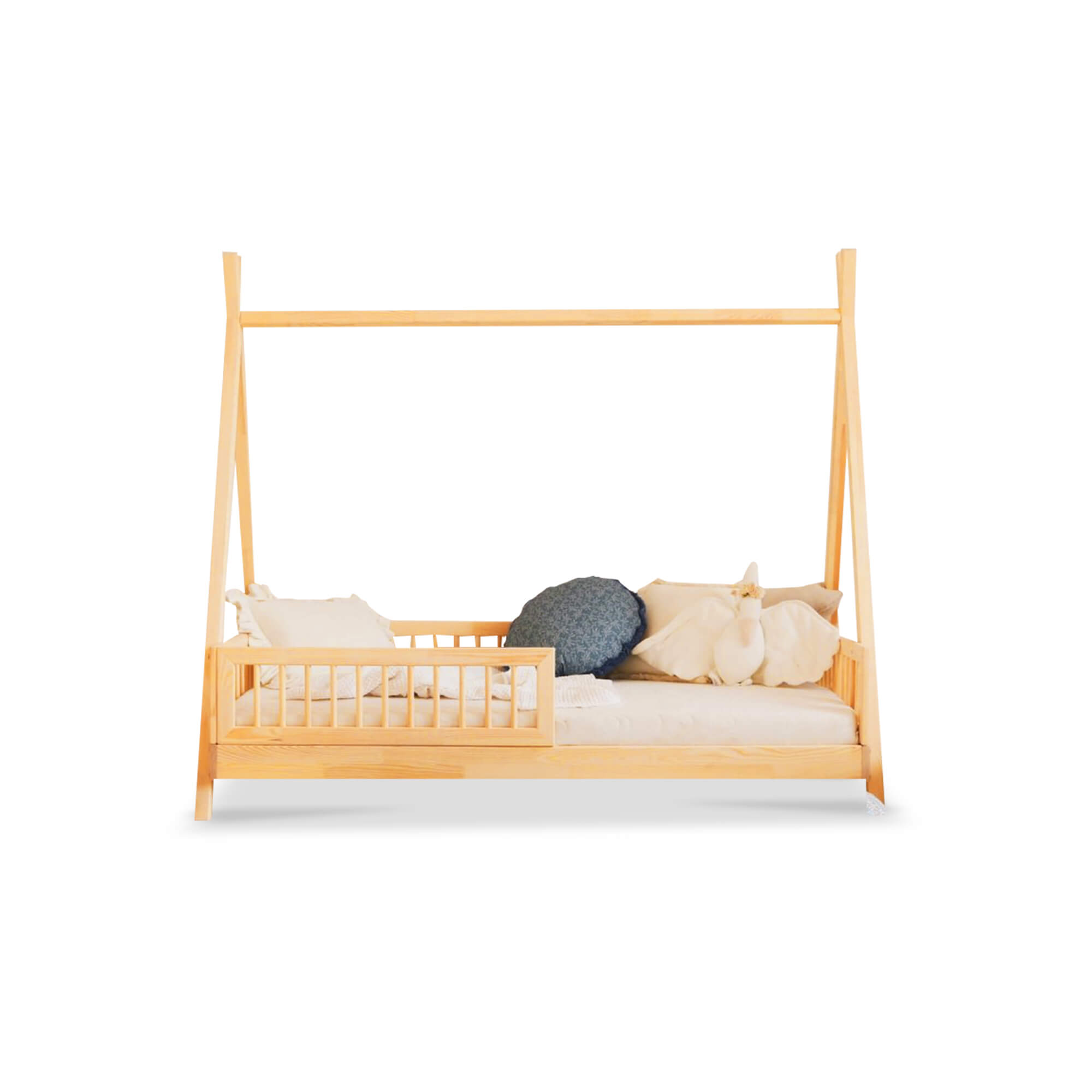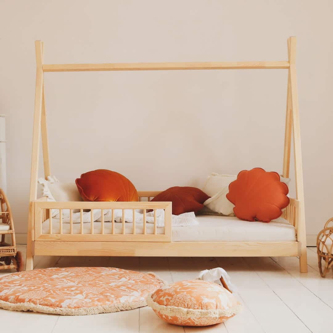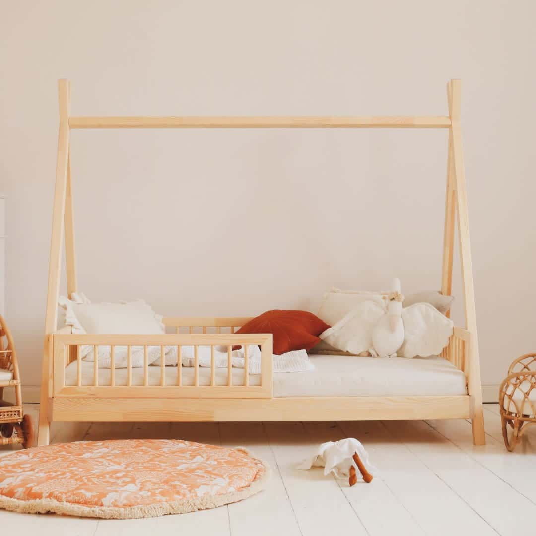 Stimulatie en Avontuur: Een uniek tipi-ontwerp om de avontuurlijke geest van kinderen te wekken. Dit vloerbed creëert een stimulerende en comfortabele speelruimte, wat helpt bij een zachte overgang van een babybedje naar een volwassen bed.