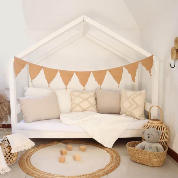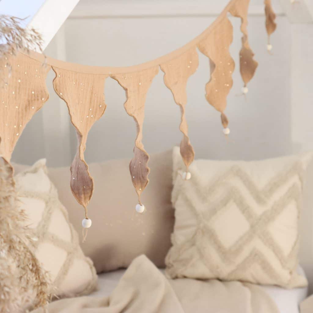 Transformeer de kamer van je kleintje in een cocon van tederheid met de “Vlaggenlijn Kaneel”. Driehoeken in kaneelkleurig muslin, verrijkt met gouden stippen, brengen subtiele elegantie en een rustgevende sfeer. Het stof, gecertificeerd volgens Oeko-Tex, is huid- en milieuvriendelijk en garandeert veiligheid en kwaliteit. Gemakkelijk wasbaar, weerstaat het speelplezier en de tand des tijds, waardoor het een praktische keuze voor ouders en betoverend voor kinderen is.
