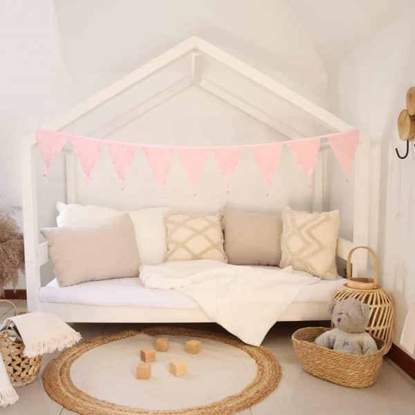 Breng zachtheid naar de kamer van je kind met de “Vlaggenlijn Goudroze”. Deze delicate versiering, met driehoeken van zachtroze muslin en gouden accenten, creëert een sprookjesachtige sfeer die de creativiteit en vredige slaap van je kleintje stimuleert. Zorgvuldig gemaakt in de Europese Unie, garandeert het kwaliteit en veiligheid, met een Oeko-Tex certificering. Praktisch, het is machinewasbaar, wat duurzaamheid en gemak bij onderhoud biedt.